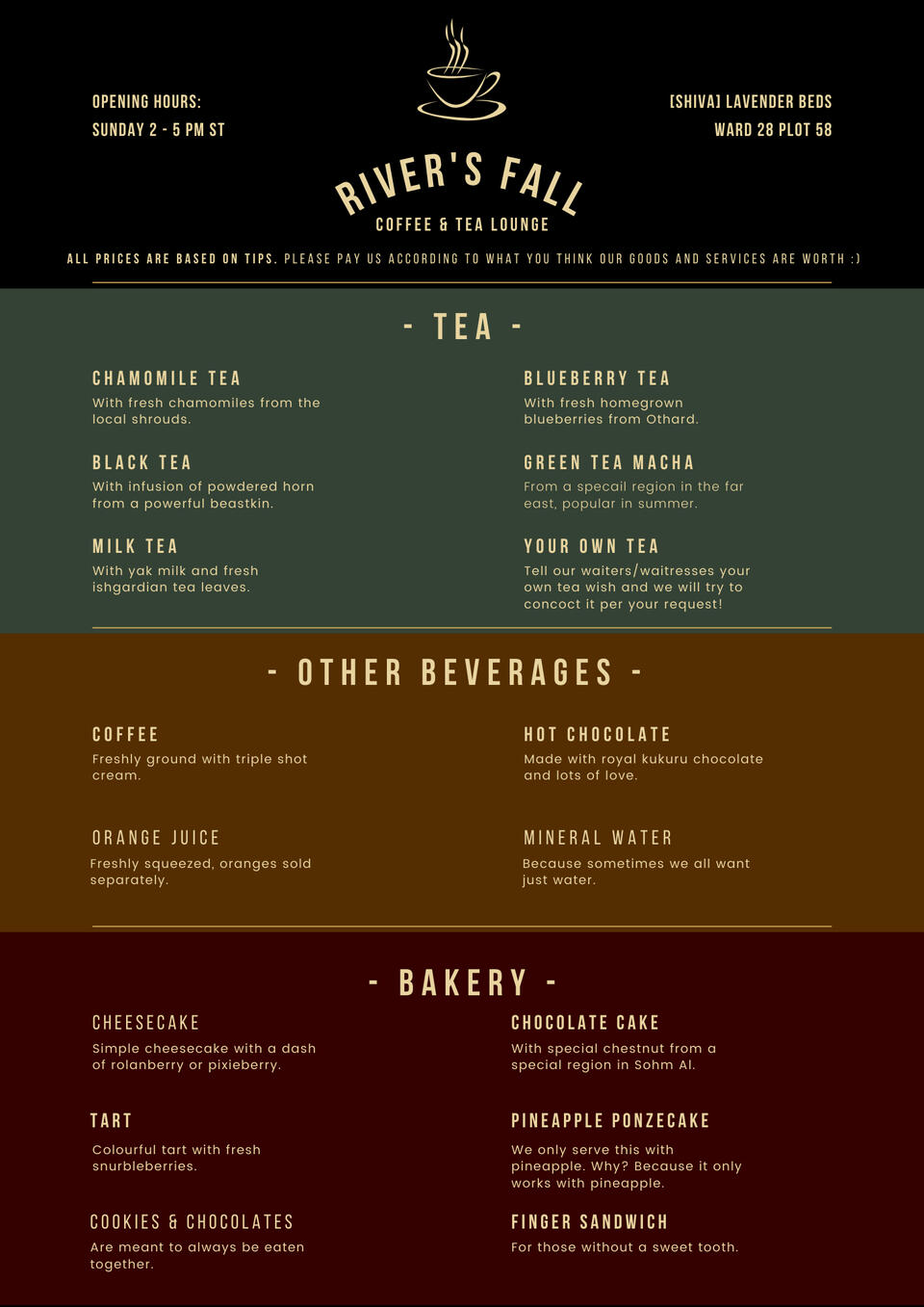 River's Fall Coffee & Tea Lounge is open for you to enjoy afternoon coffee, tea, and snacks!